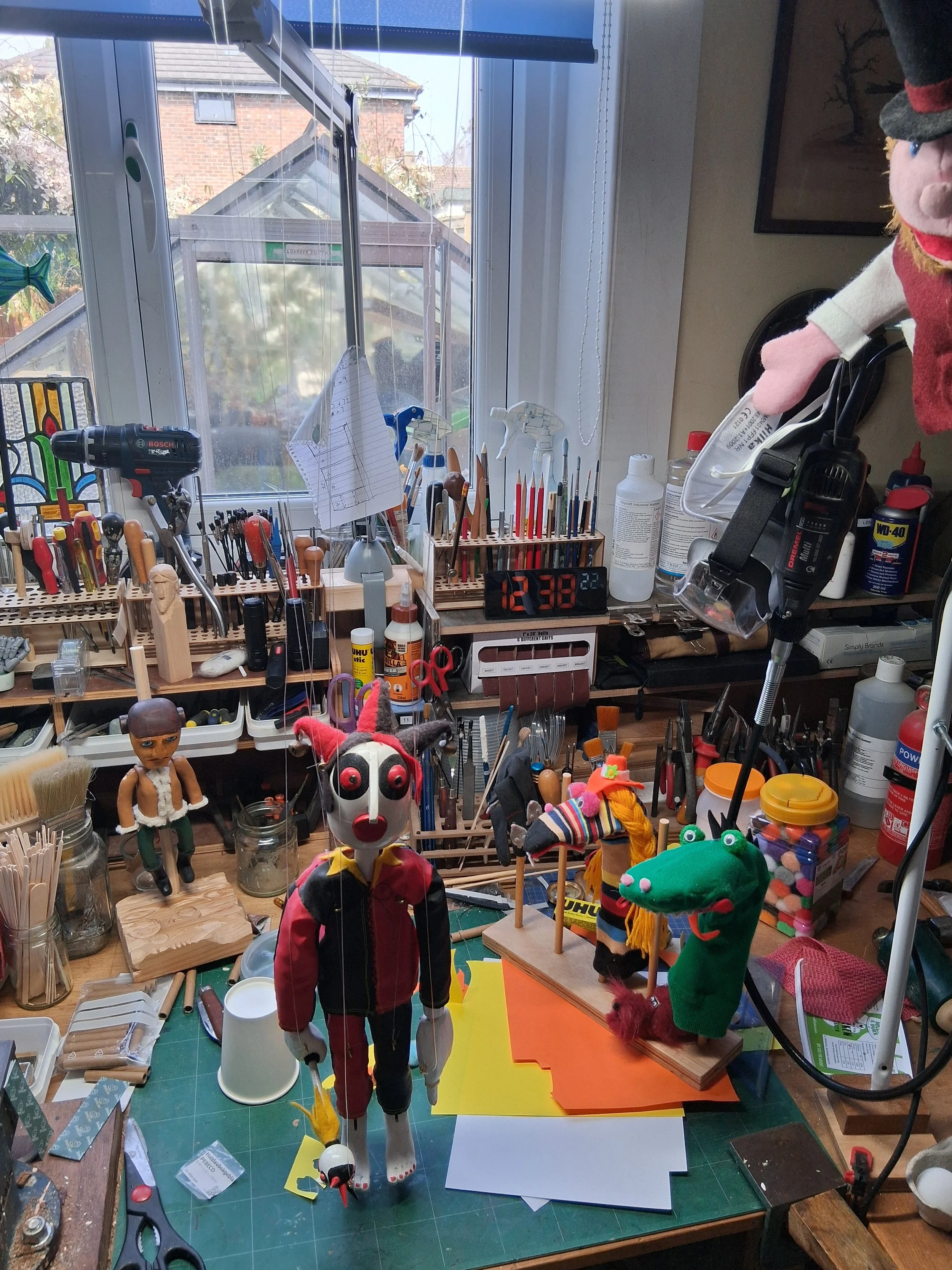 Andy’s main area of interest is in Puppets and associated areas that involve carving, cutting out and sticking things together.